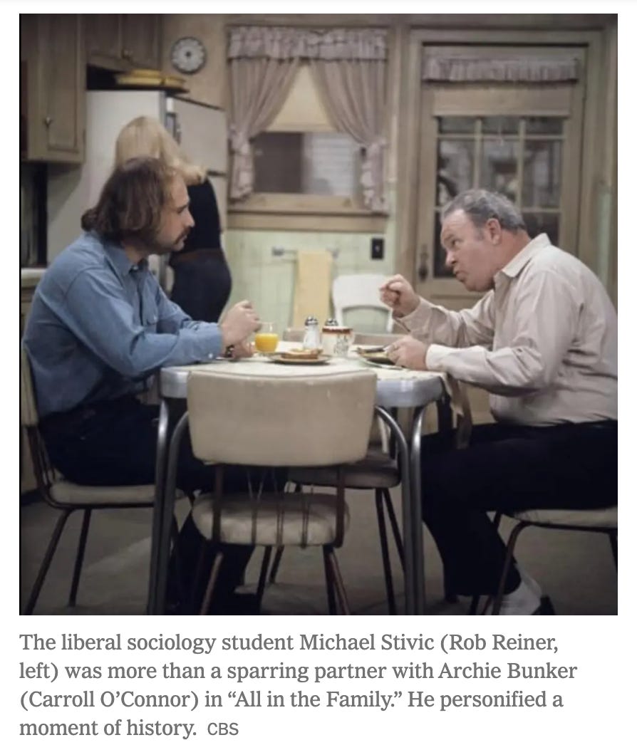 I do not know Nick Reiner. I met Rob Reiner through Chad Griffin and AFER. However, like so many others, I appreciated him “representing” hippies as caring progressives on “All in the Family.” He was similarly caring in real life, as evidenced by his humble, emotional reaction on Piers Morgan’s show, honoring Erika Kirk’s forgiveness of her husband Charlie Kirk’s assassin.